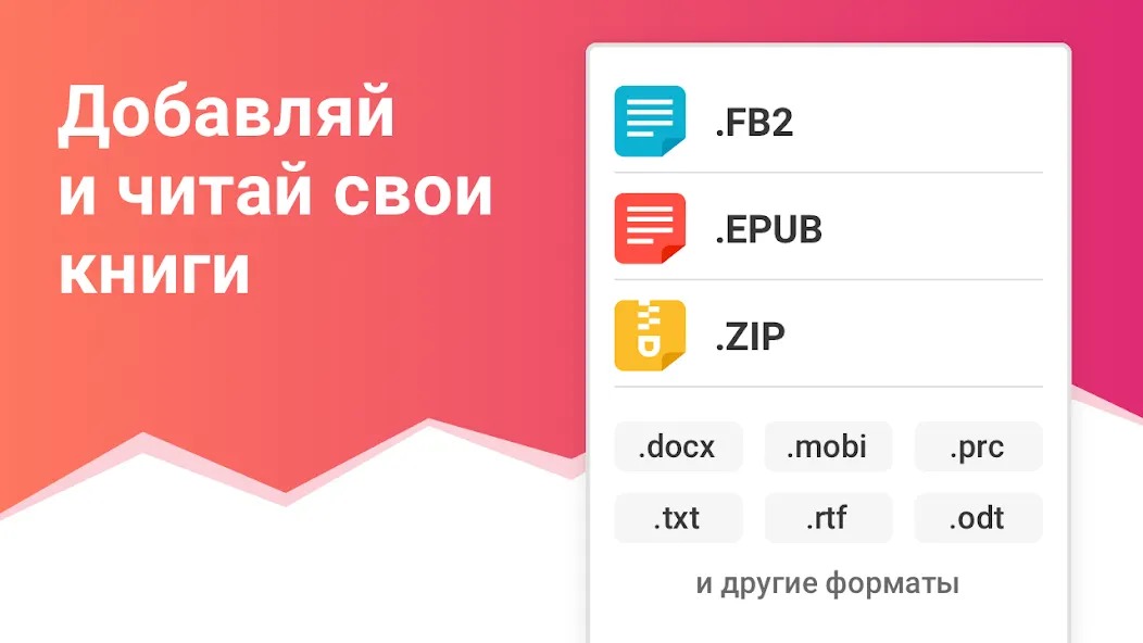 Программа eBoox на андроид поддерживает широчайший спектр форматов: FB2, EPUB, MOBI, PDF, DOC, DOCX, PRC, TXT, RTF, ODT, HTML, CBR, CBZ, а также ZIP и RAR архивы.